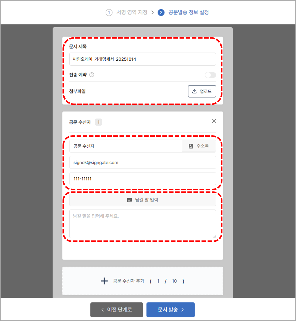 공문번호, 텍스트박스, 서명 등을 입력해서 발송할 수 있습니다.