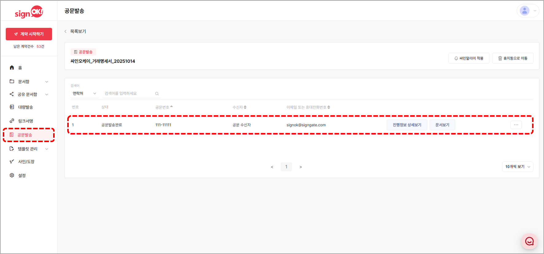 공문발송은 상대방의 서명이 들어가지 않는 공문 형태의 문서를 발송할 수 있는 기능입니다.