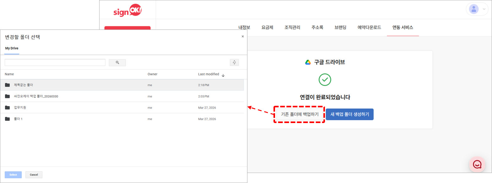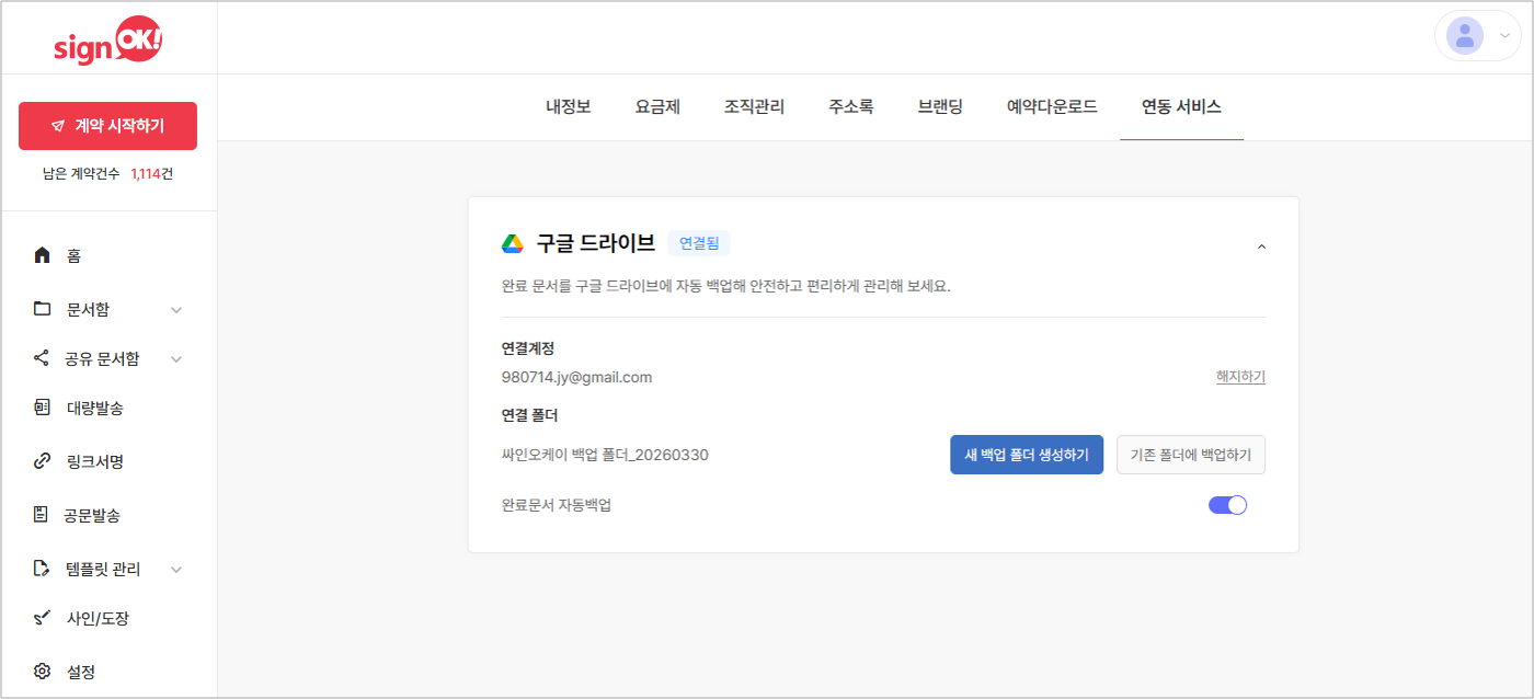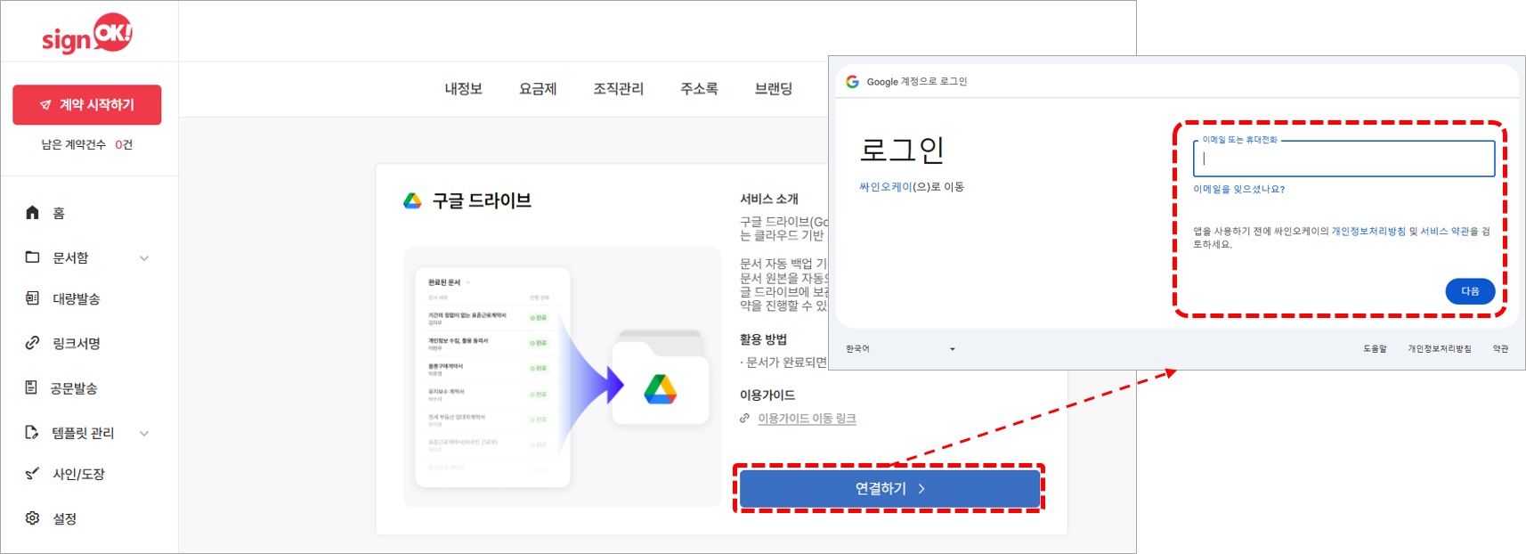 1. 싸인오케이에 로그인 후, [설정] -> [연동 서비스] -> [구글 드라이브]로 이동합니다