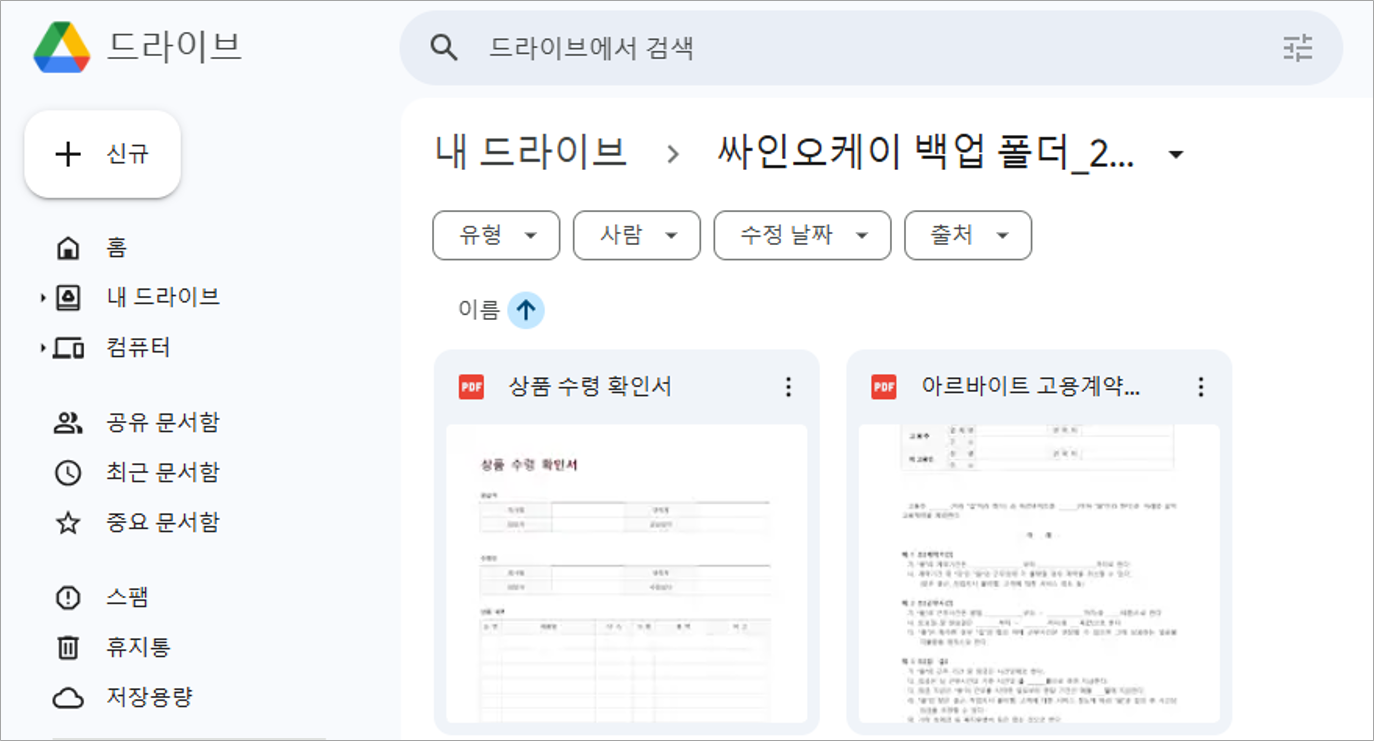 4. 연동 이후 내가 발송한 문서가 완료되면 문서가 구글 드라이브 폴더에 자동으로 저장됩니다.