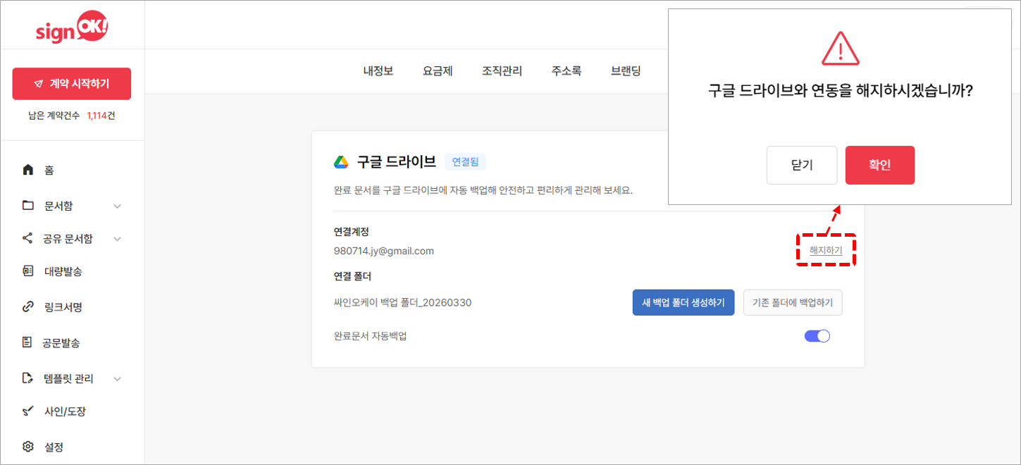 해지 이후에는 완료 문서가 구글 드라이브에 저장되지 않습니다.