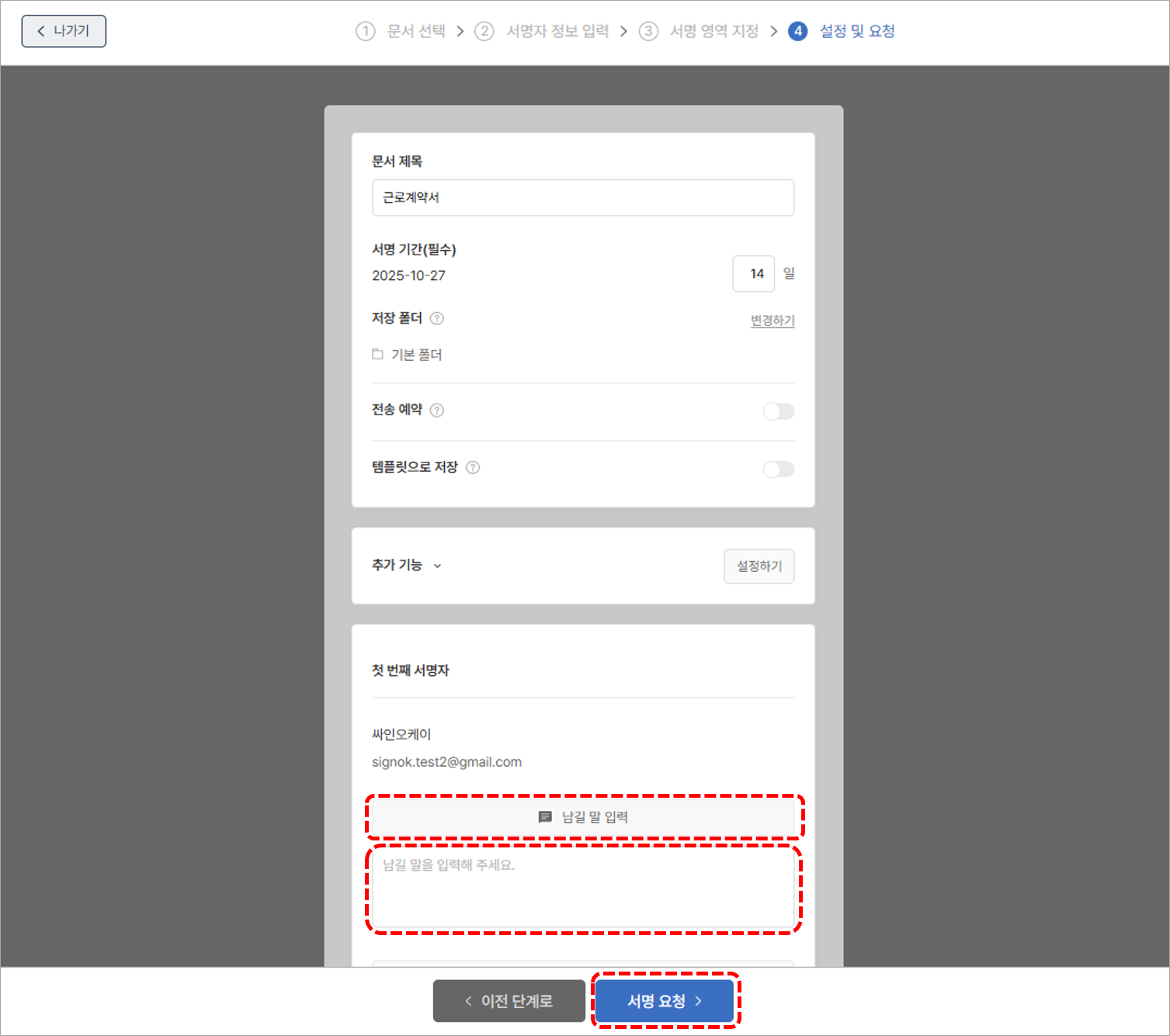 4. 각 서명자에게 남길말을 입력하고 서명 요청을 발송합니다.