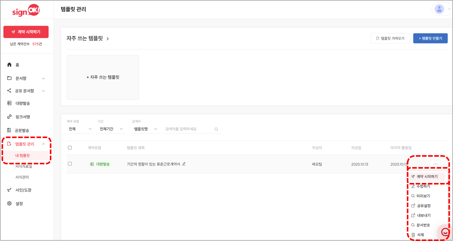1. 싸인오케이 로그인 후, 좌측의 [템플릿 관리]의 [템플릿] 메뉴를 클릭합니다.