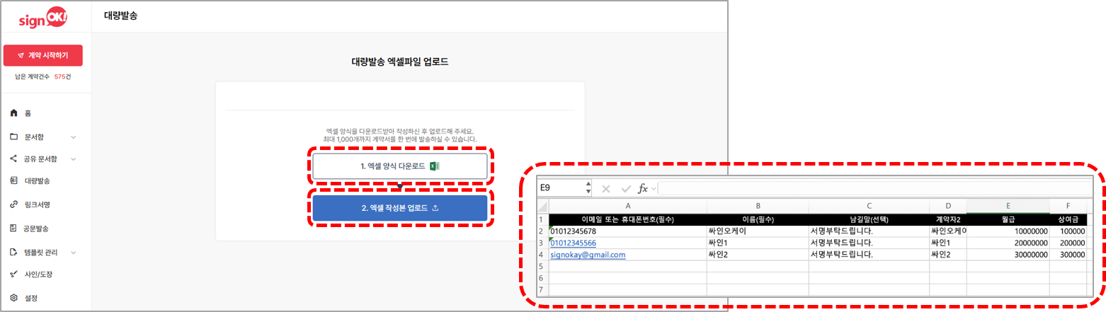 1. 싸인오케이 로그인 후, 좌측의 [대량발송] 메뉴를 통해 대량발송 문서함으로 이동합니다.