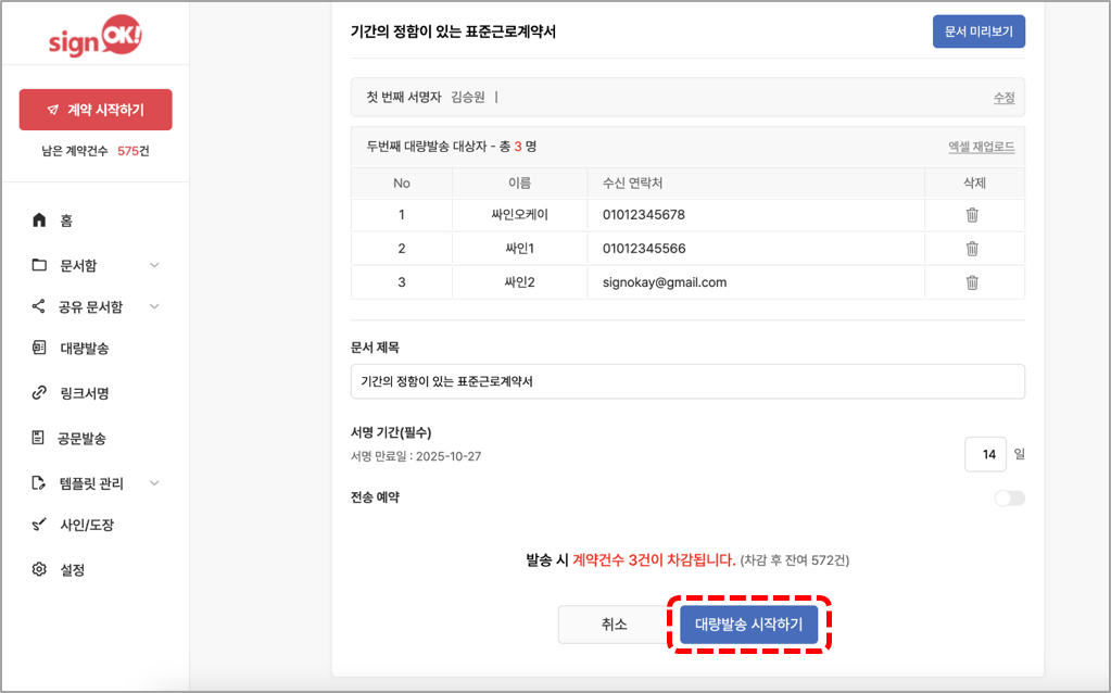 9. 문서의 제목과 서명기간 등을 설정한 뒤, [대량발송 시작하기] 버튼을 통해 일괄 서명 요청을 진행합니다.