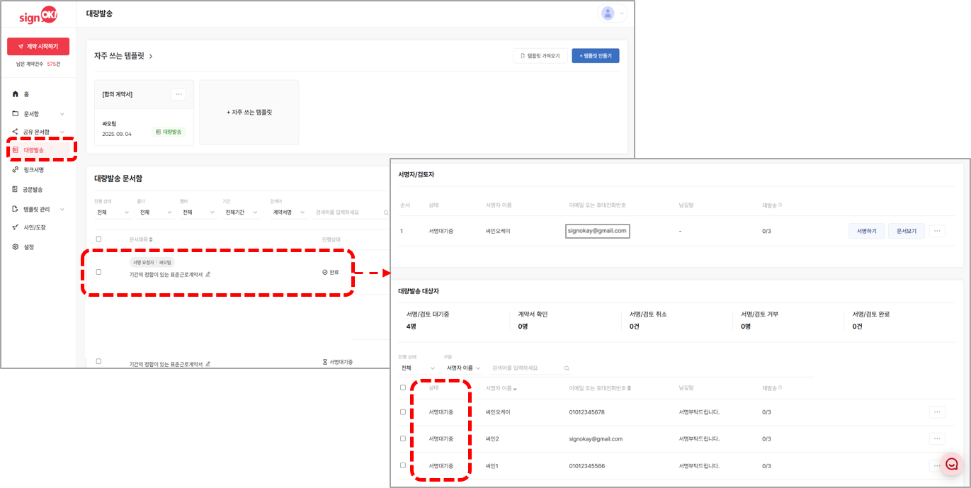 2. 발송한 대량발송을 클릭하여 서명자별 서명 진행 상태를 확인할 수 있습니다.