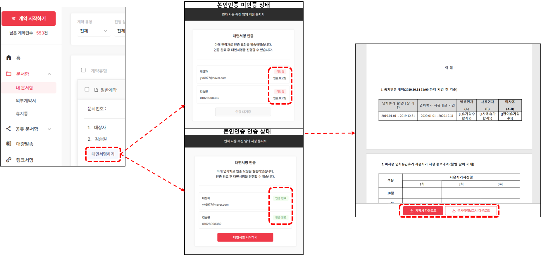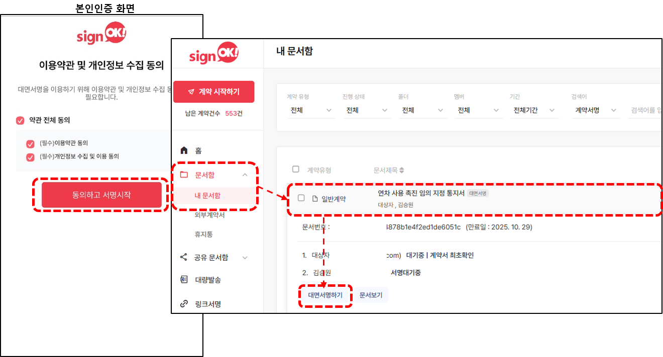3. 기입한 수신자의 이메일 주소 또는 카카오톡으로 발송된 대면서명을 위한 본인인증을 진행합니다.