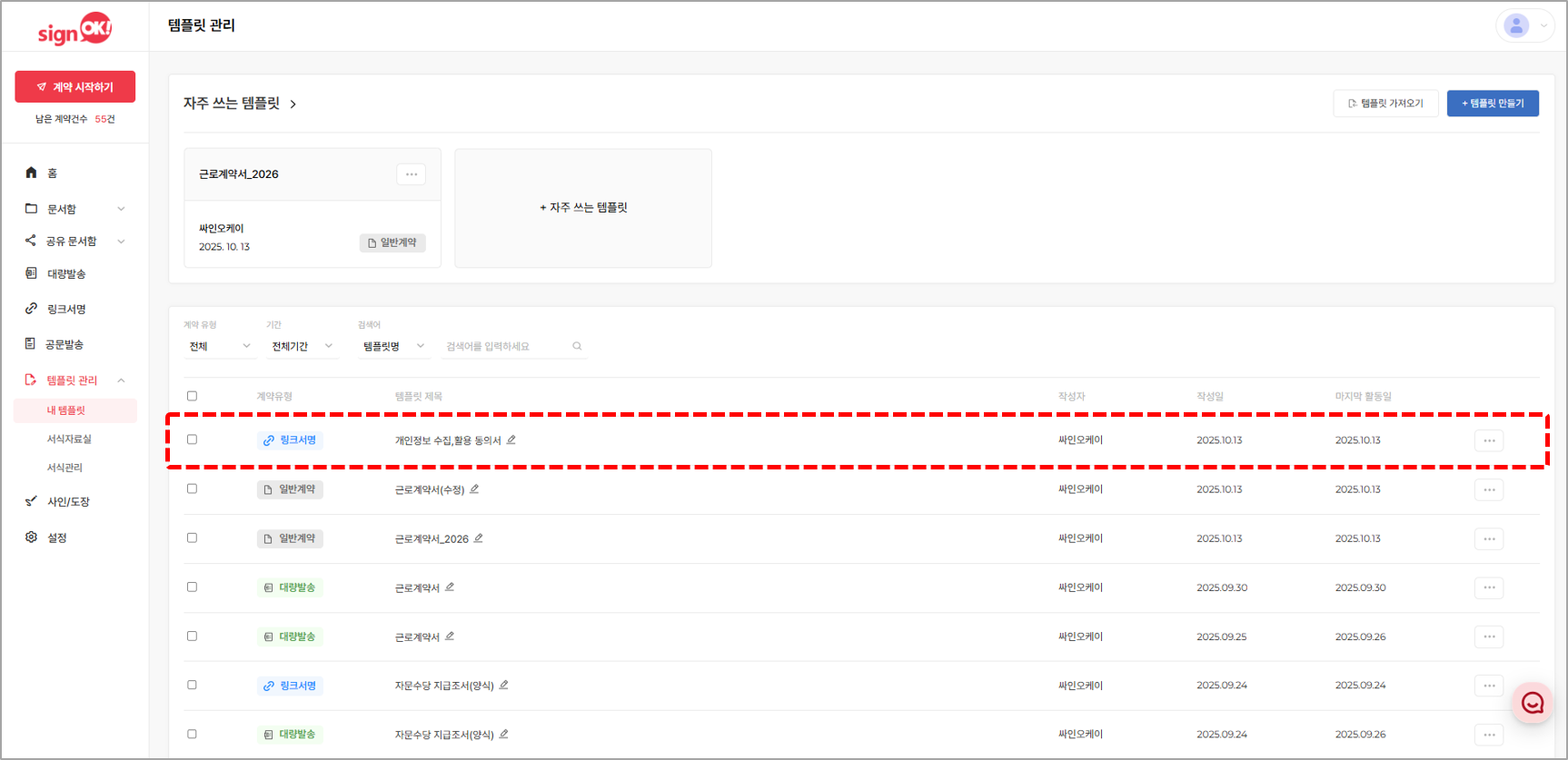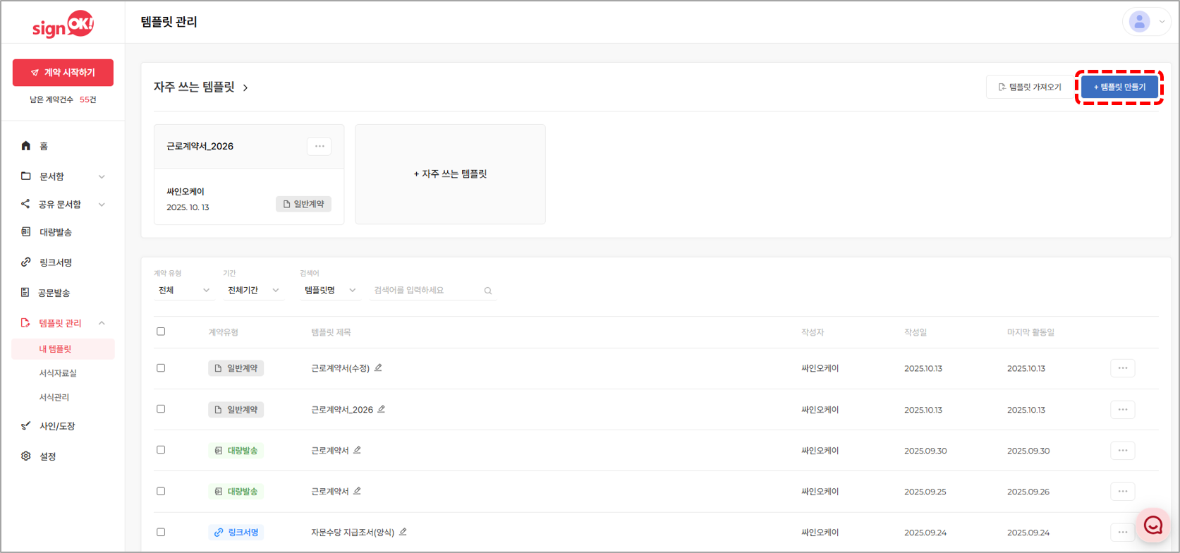 1. 싸인오케이 로그인 후, 좌측의 [템플릿 관리]의 [템플릿] 메뉴를 클릭합니다.
