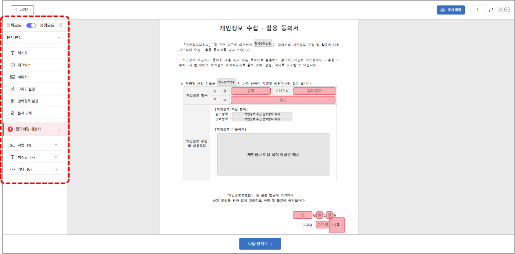 4. 서명 영역 지정 단계에서 사인/도장, 텍스트, 기타 박스 등을 문서 내 원하는 위치에 설정 후 [다음] 버튼을 클릭합니다.