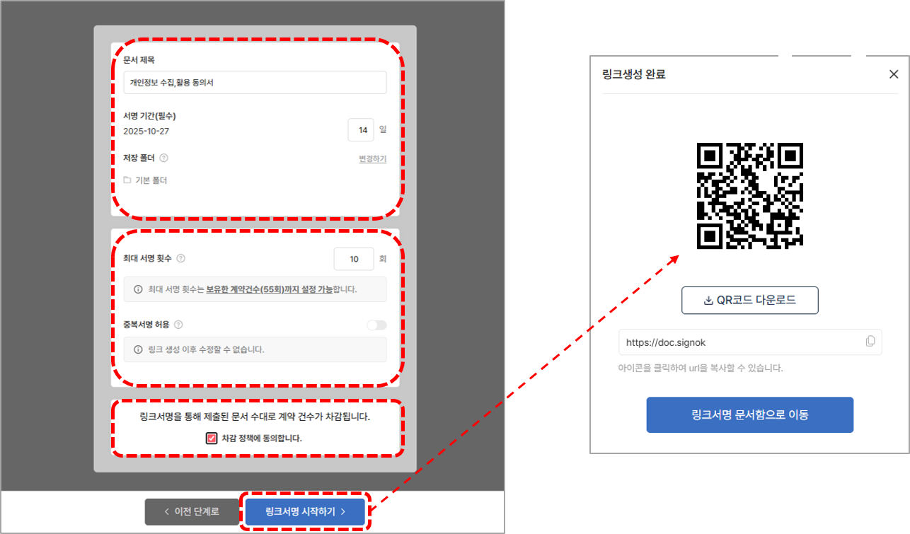 4. 모든 설정을 완료하였으면 계약 건수 차감 동의를 체크한 뒤 하단의 [링크서명 시작하기] 버튼을 통해 링크와 QR코드가 생성됩니다.