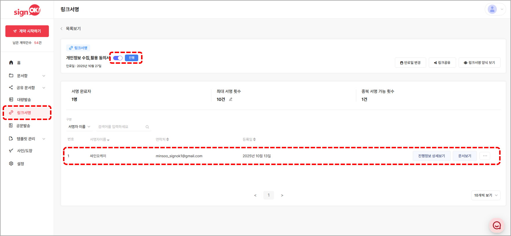 2. 생성한 링크서명을 클릭하여 서명 제출한 문서를 확인할 수 있습니다.