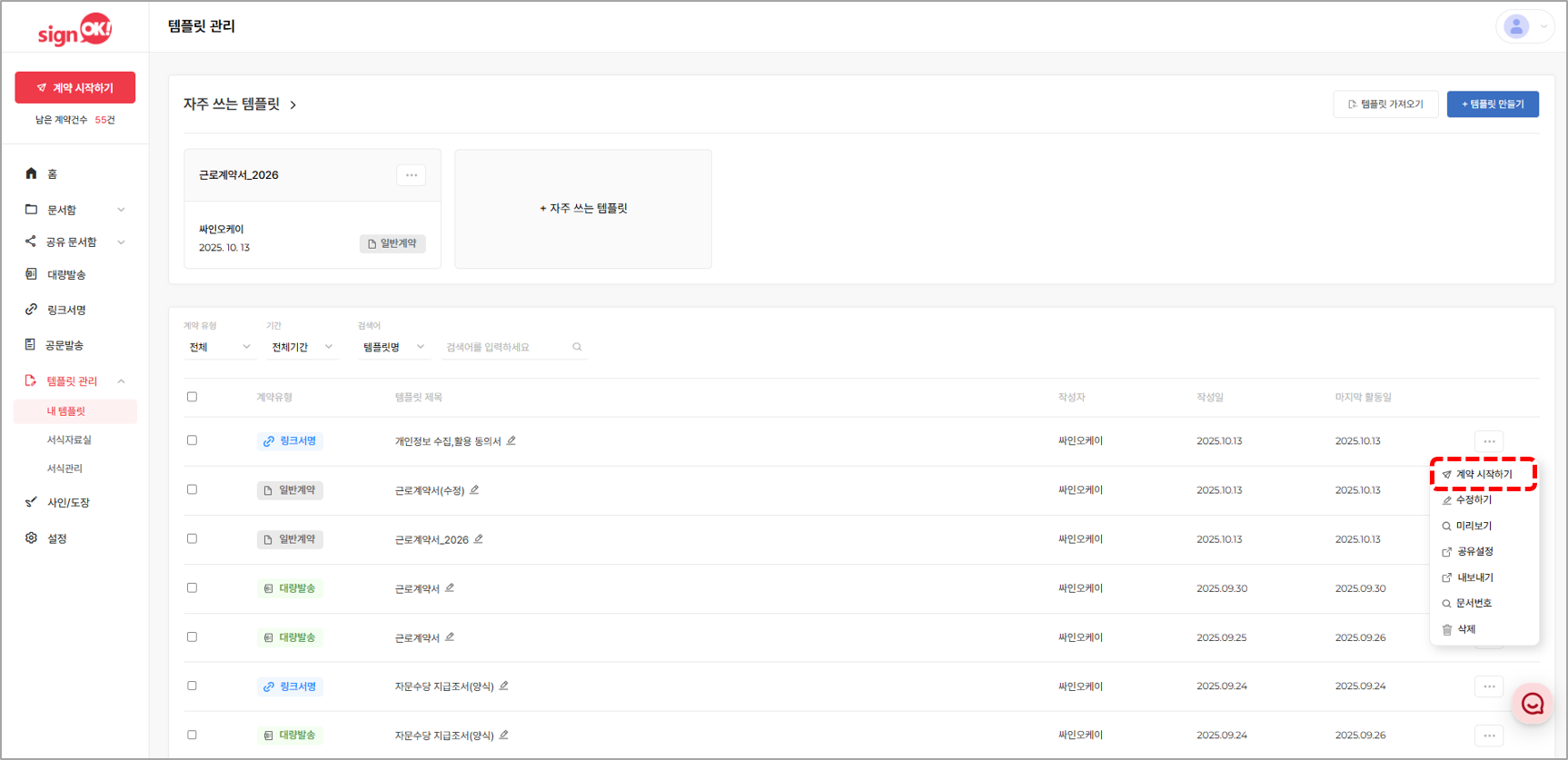 2. 발송하고 싶은 템플릿을 클릭하여 우측 메뉴의 [링크서명 시작하기]를 클릭합니다.