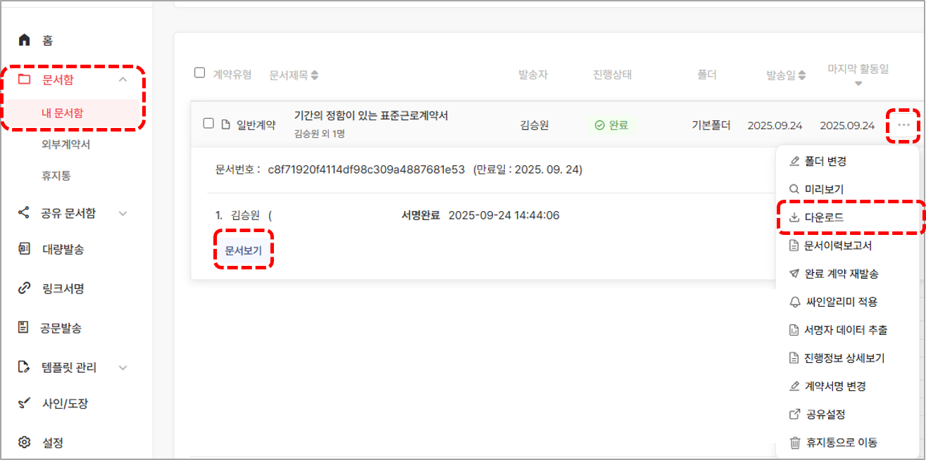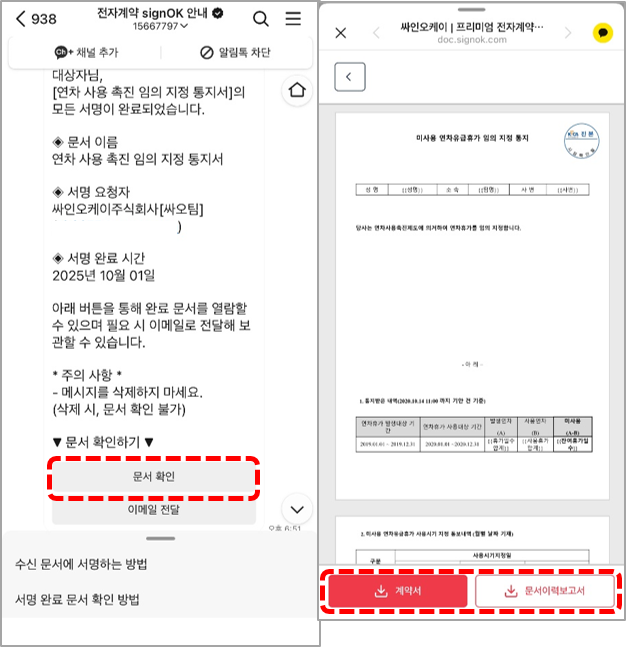 서명 완료 메시지의 [문서 확인] 버튼을 통해 문서를 열람 및 다운로드 할 수 있습니다.