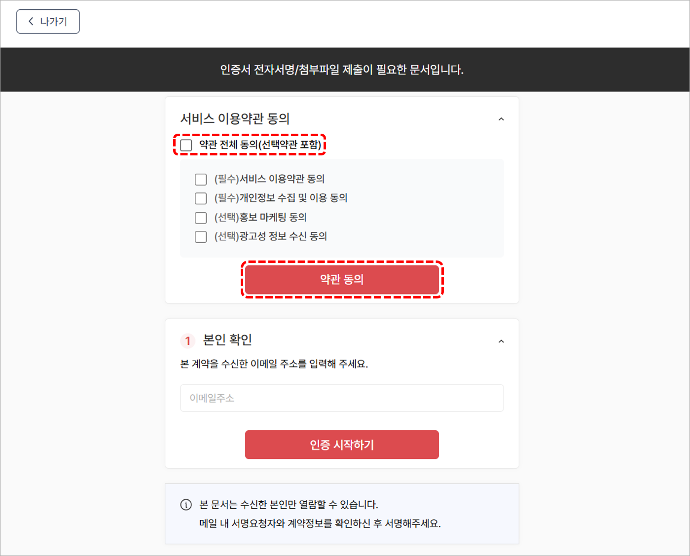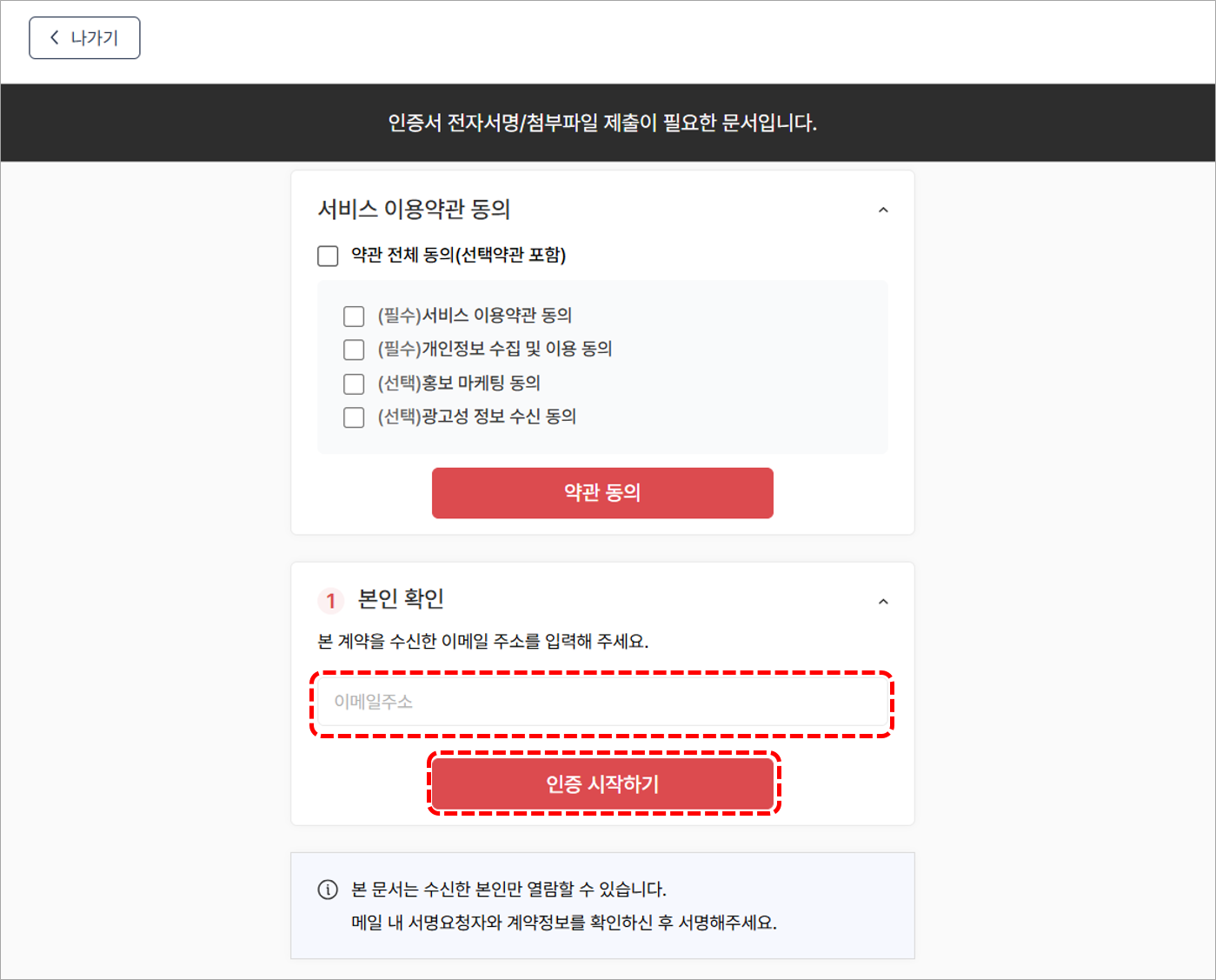 2. 문서열람을 위해 본인의 이메일 주소를 정확히 입력 후 [인증 시작하기] 버튼을 클릭합니다.