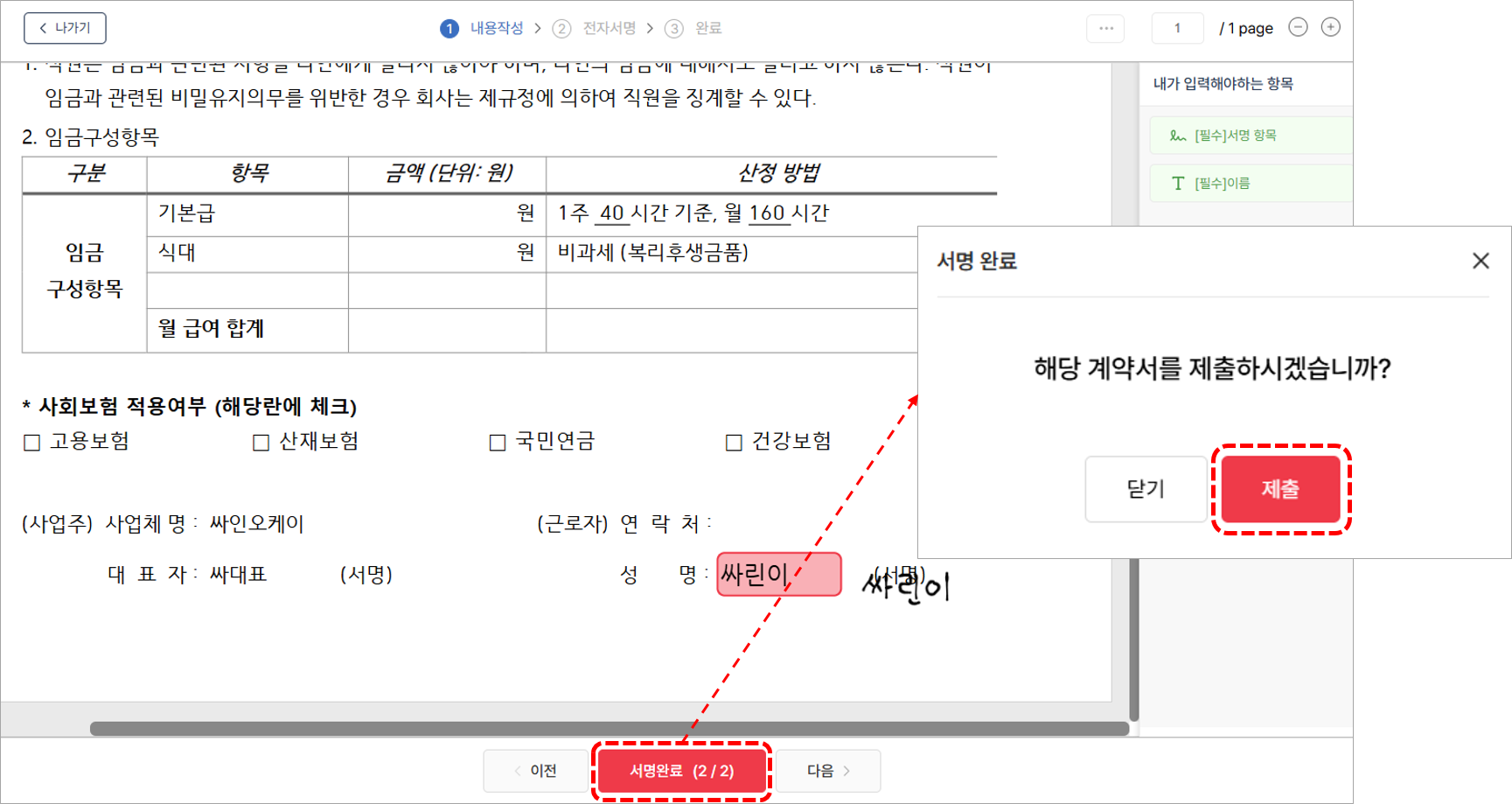 6. 모든 내용을 입력했으면 중앙 하단의 [서명완료] 버튼을 클릭합니다.