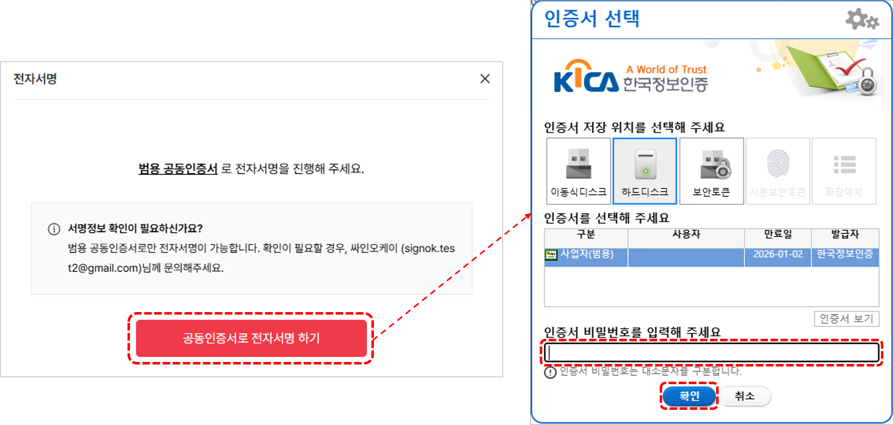 서명 요청자가 공동인증서 인증 방식을 선택한 경우에는 아래 방법을 통해 서명 진행이 가능합니다.