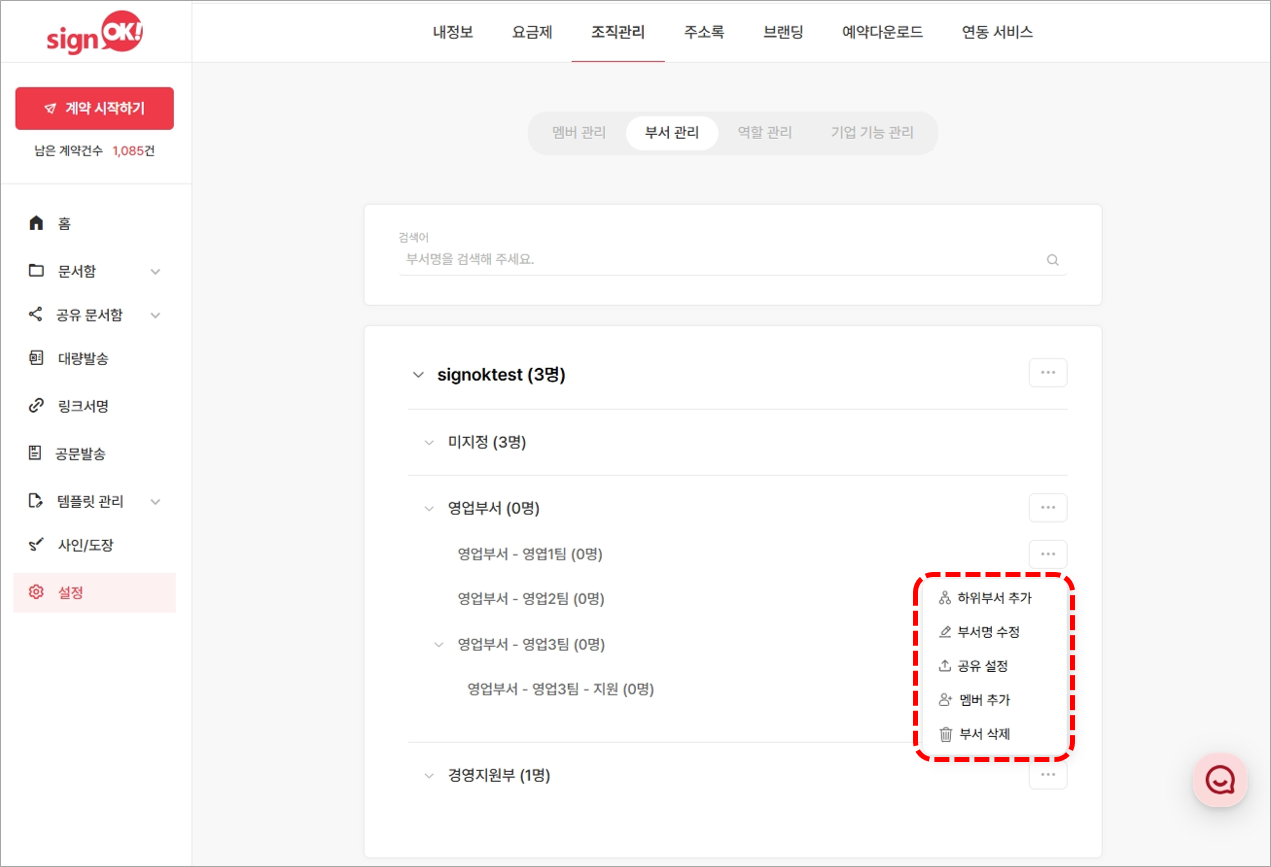 2. 생성된 부서의 우측 […] 버튼를 통해 하위부서를 추가할 수 있습니다.