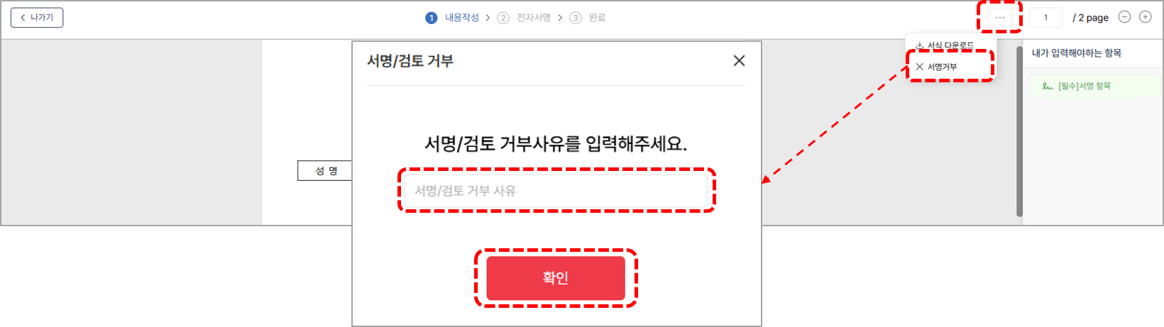 서명 거부 방법1. 이메일/카카오톡으로 수신한 서명 요청에 서명 요청자가 남긴 말을 확인 후, [서명하기] 버튼을 클릭합니다.2. 문서열람을 위해 본인의 휴대폰 번호를 정확히 입력 후 [인증 시작하기] 버튼을 클릭합니다.3. 서명 페이지 우측 상단 추가메뉴[ㆍㆍㆍ]을 클릭합니다.4. [서명거부] 버튼을 클릭하여 서명/검토 거부 사유를 입력하고 확인을 누르시면 서명 거부하기가 완료됩니다.