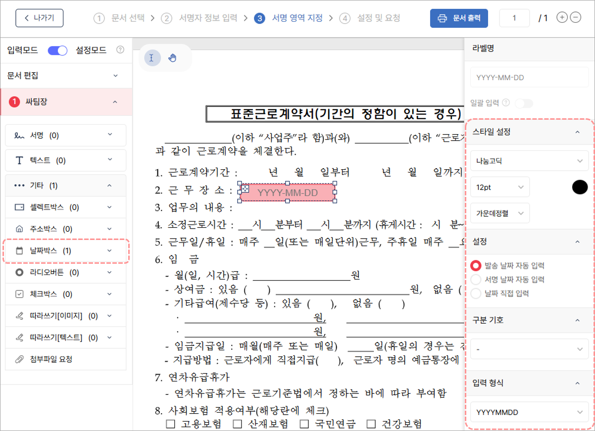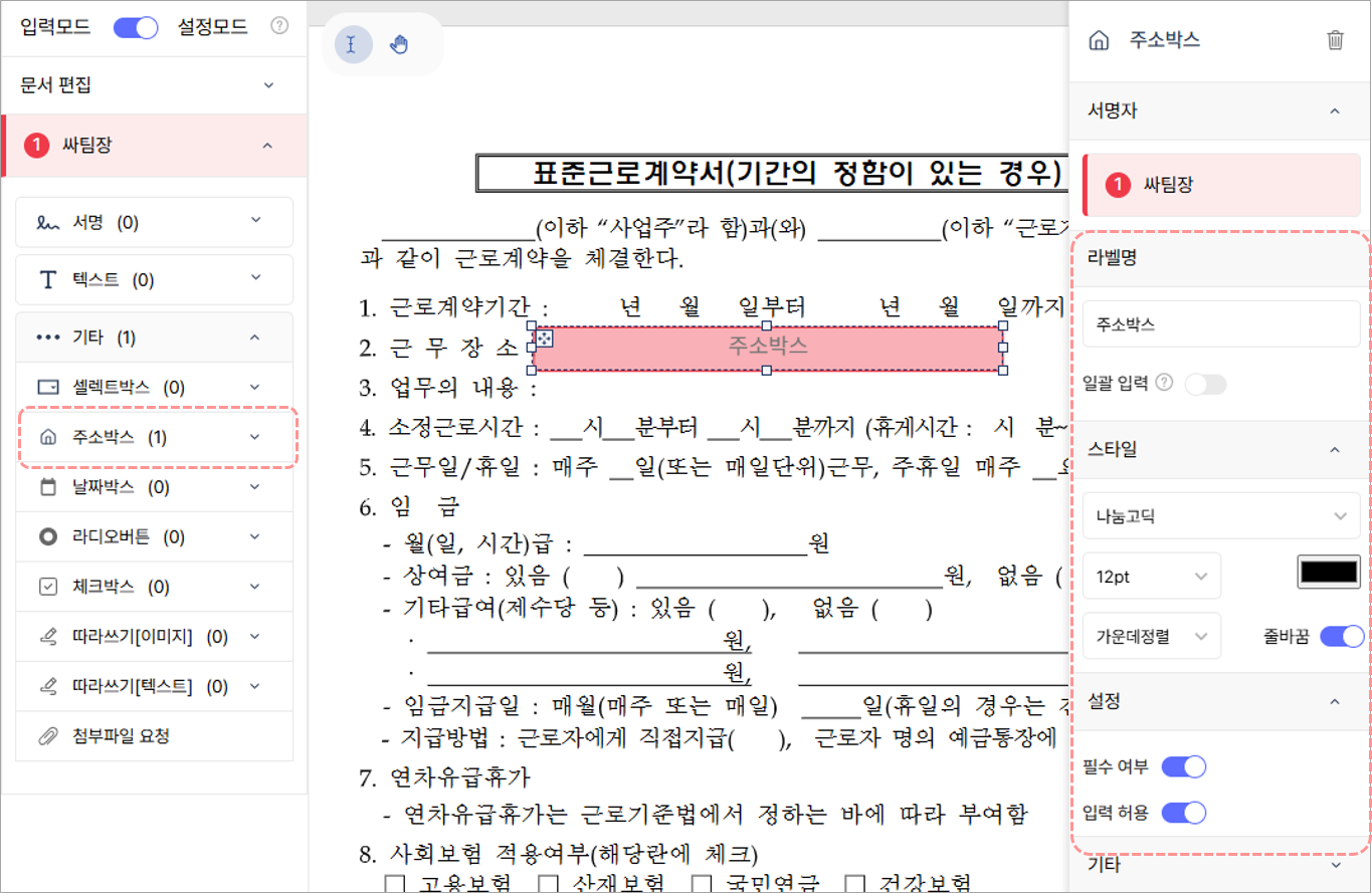 입력모드(토글 버튼 변경): 생성한 서명박스에 텍스트 입력, 이미지 입력, 체크박스 표시 등 박스를 사전에 기입하고 발송