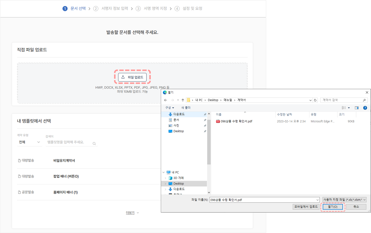 2. 발송할 문서를 파일 업로드 박스를 클릭하여 첨부합니다.