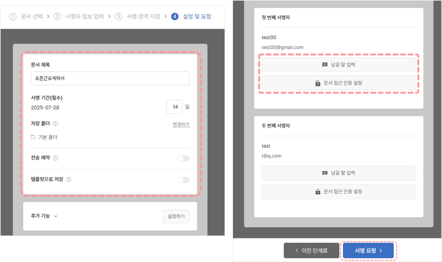 문서 제목, 서명기간(0일~365일), 저장 폴더, 전송 예약, 템플릿으로 저장, 추가기능(참조자 설정, 첨부파일 업로드), 각 서명자의 문서접근 인증 설정, 남길 말 입력을 설정할 수 있습니다.