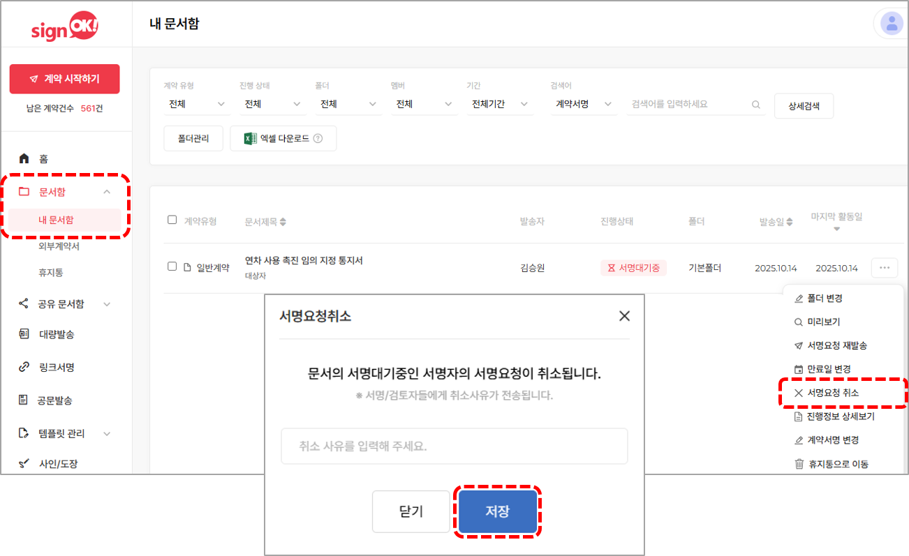 3. 서명요청 취소를 클릭 후 취소 사유를 입력한 뒤 [저장] 버튼을 클릭하면 서명 요청 취소가 완료됩니다.