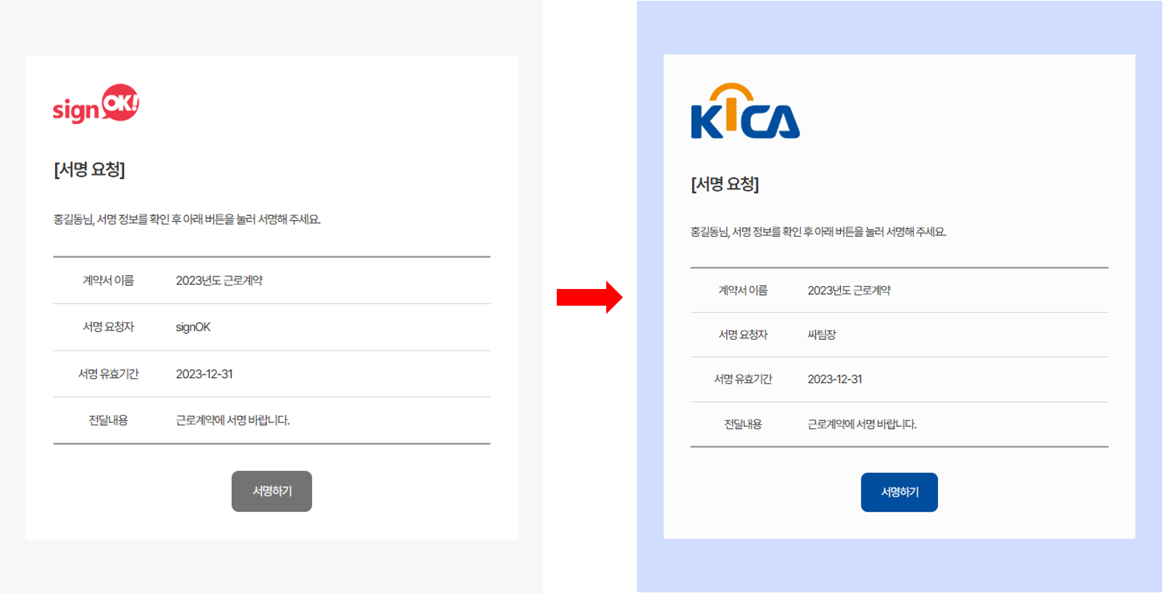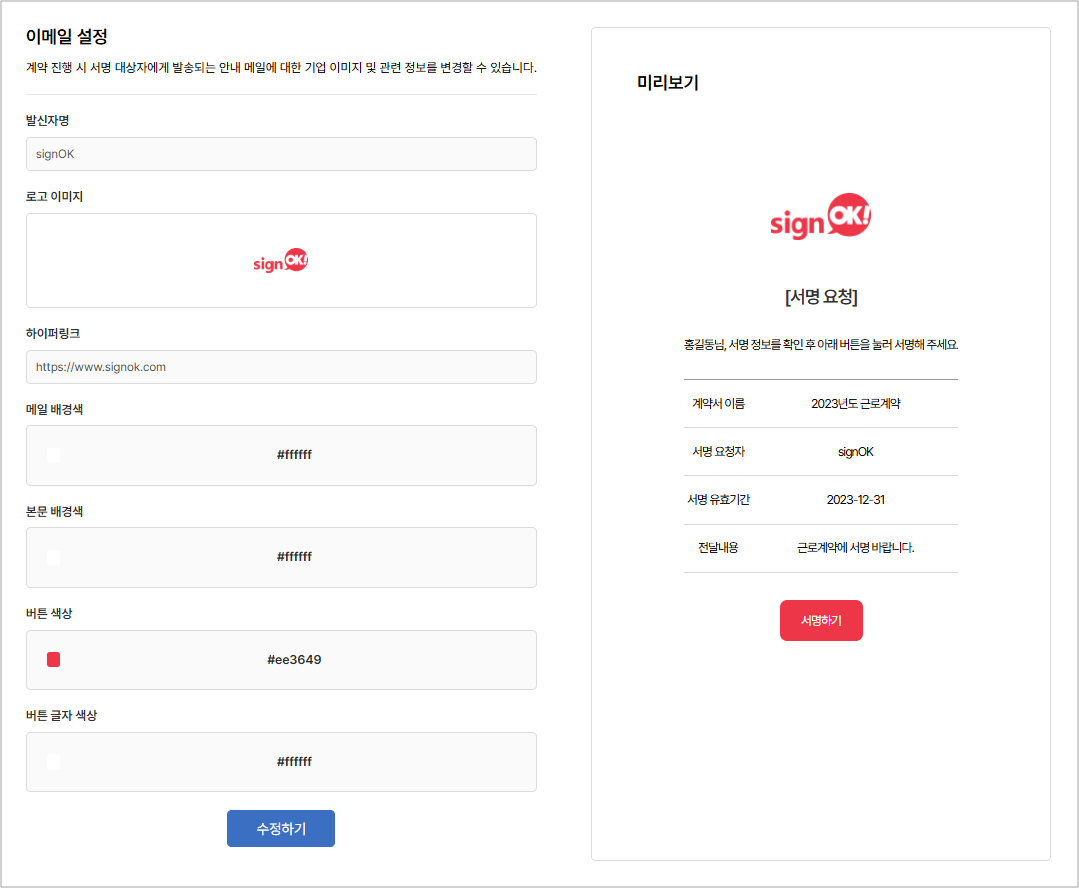 기존 ‘signOK’로 발송되던 이메일 발신 정보를 우리 기업명으로 변경할 수 있습니다.