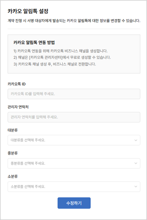 서명 대상자에게 발송되는 카카오 알림톡을 우리 회사의 채널로 변경할 수 있는 기능입니다.