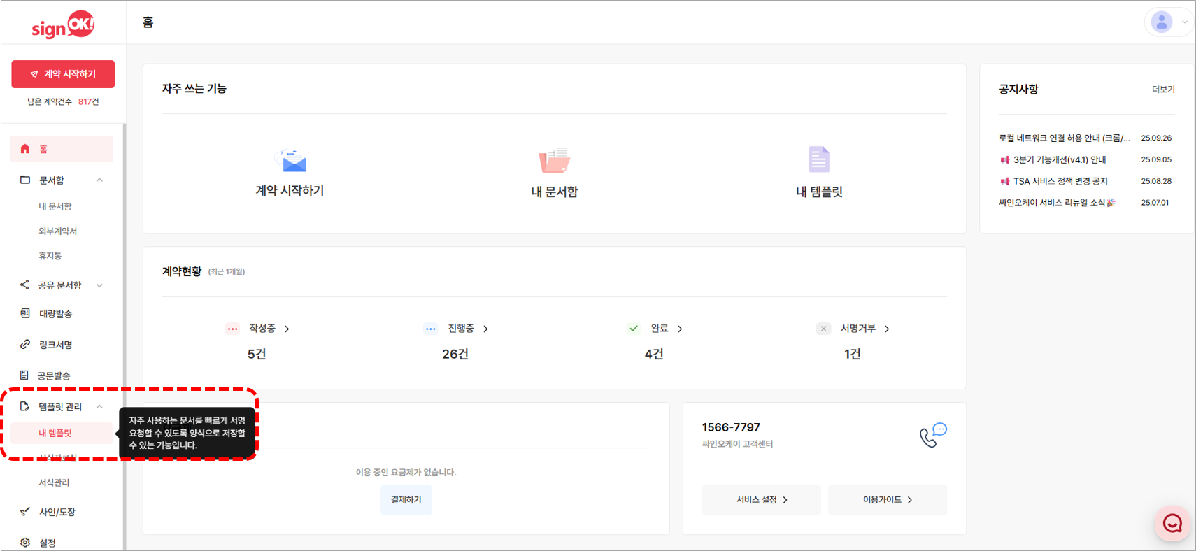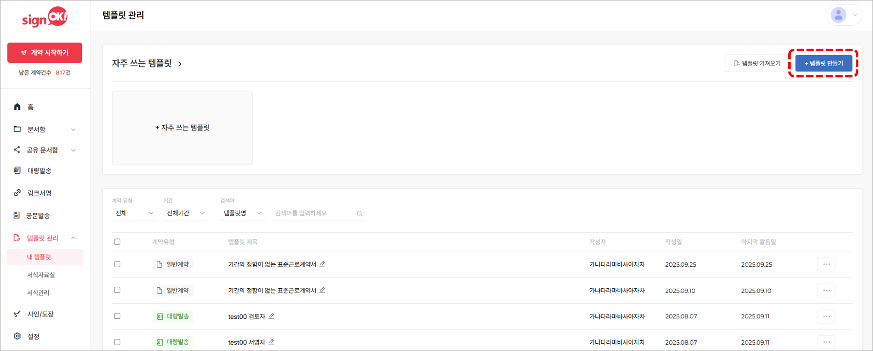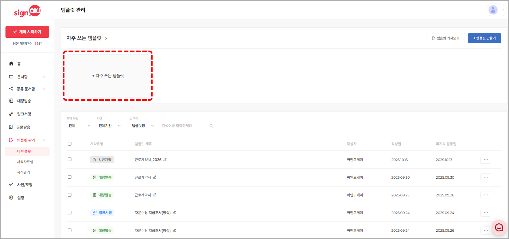 템플릿은 자주 사용하는 문서를 빠르게 서명 요청할 수 있는 양식으로 저장할 수 있는 기능입니다.