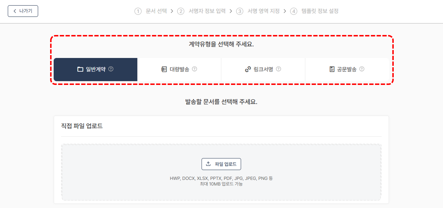 3. 계약 유형을 선택합니다. (일반계약, 대량발송, 링크서명, 공문발송)