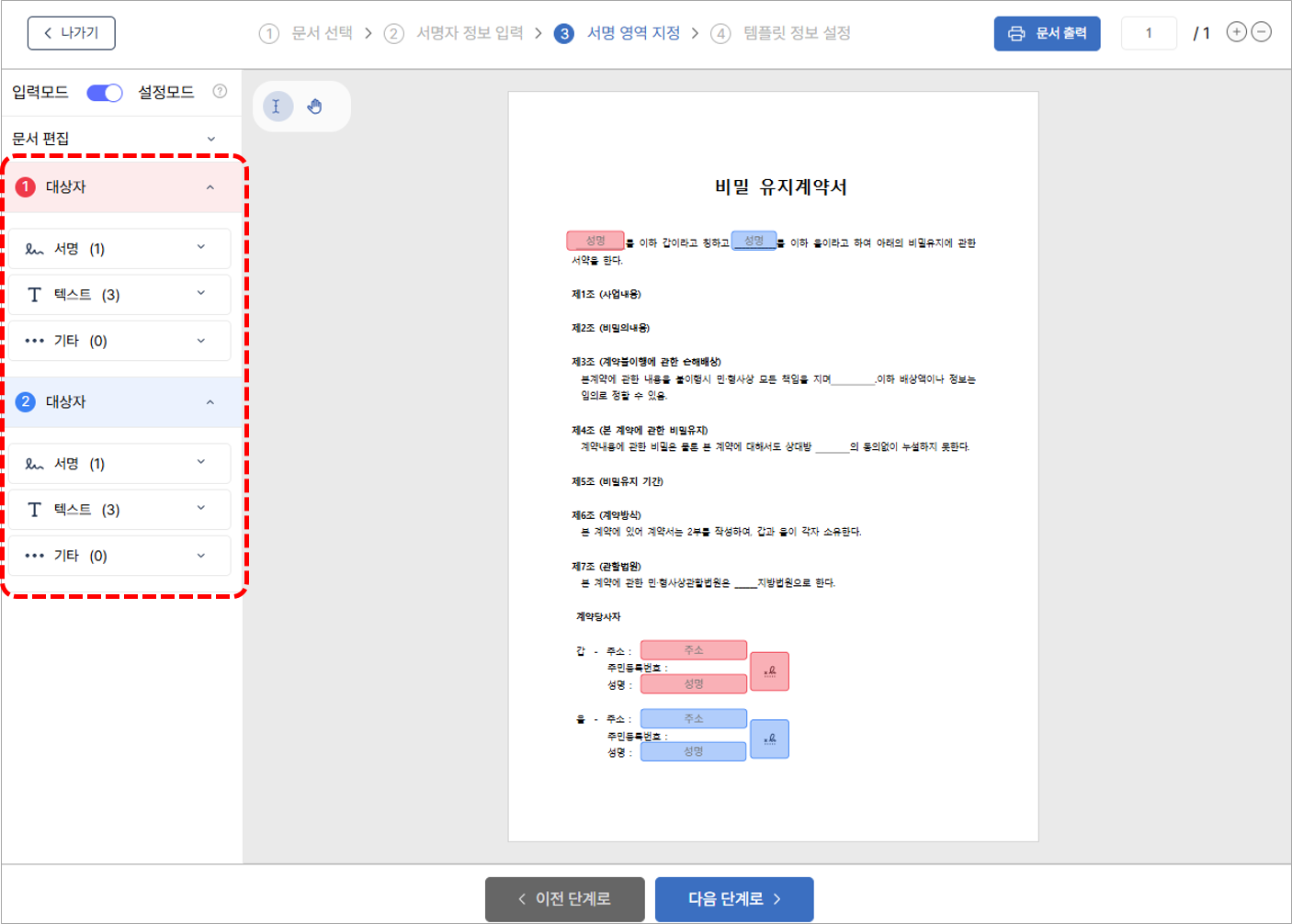 5. 서명자 정보를 미리 설정할 수 있습니다. 계약을 진행할 서명자들의 역할을 설정하고 다음 단계로 진행합니다.