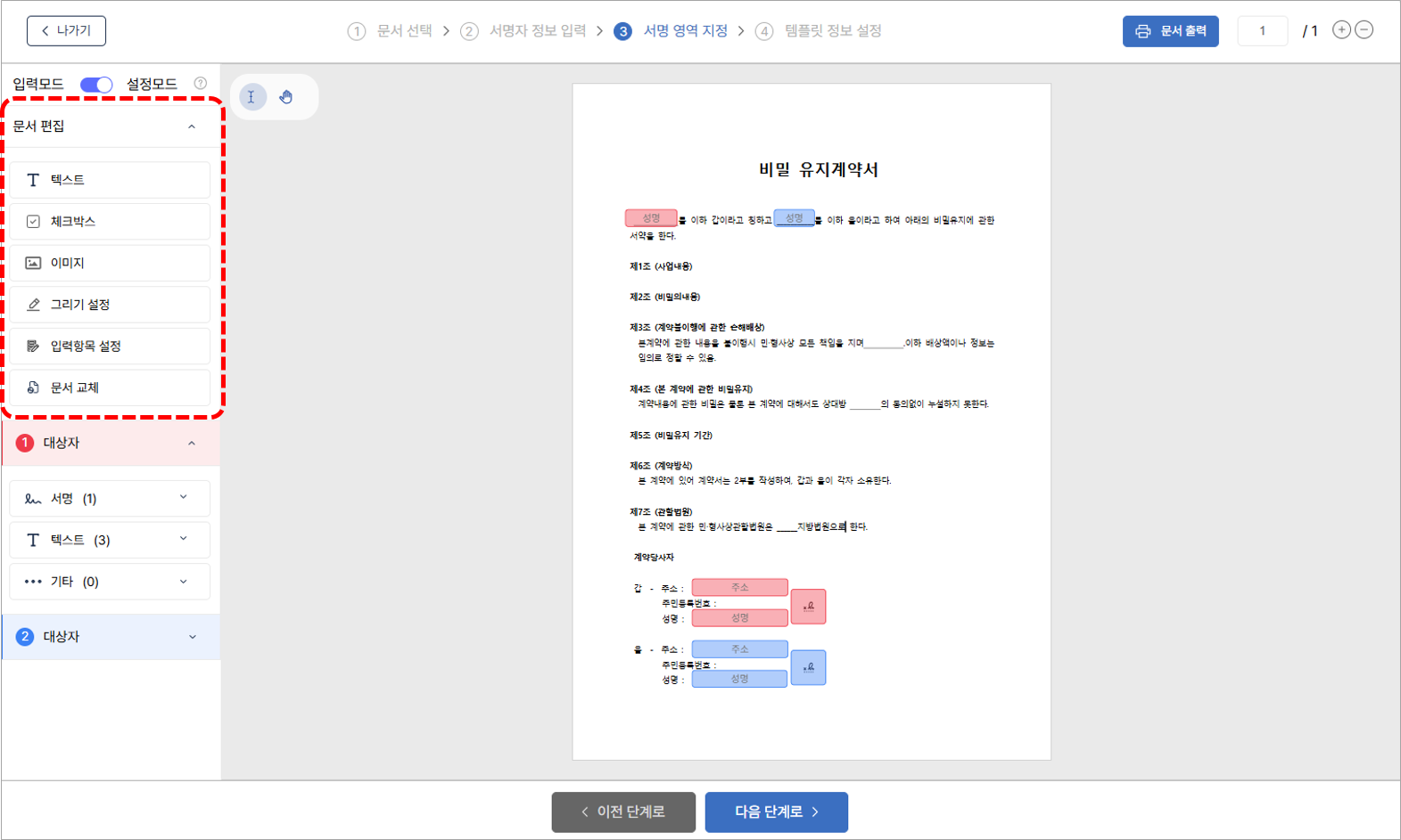6. 각 서명자들이 입력할 서명, 텍스트, 기타(셀렉트박스, 라디오박스, 체크박스, 따라쓰기)의 위치를 설정합니다.