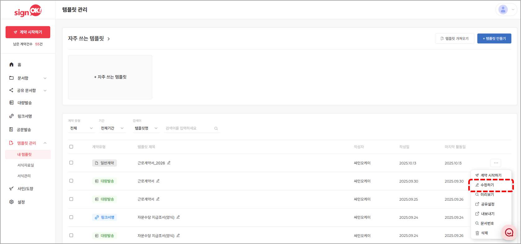 2. 수정하고 싶은 템플릿을 클릭한 후, [템플릿 수정하기] 버튼을 클릭합니다.
