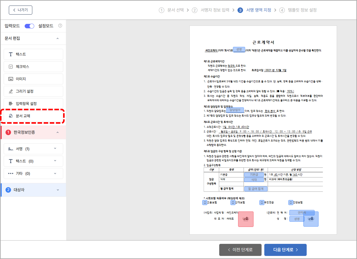 3. [서명 영역 지정] 단계에서 좌측 상단의 문서 편집 메뉴를 클릭합니다.