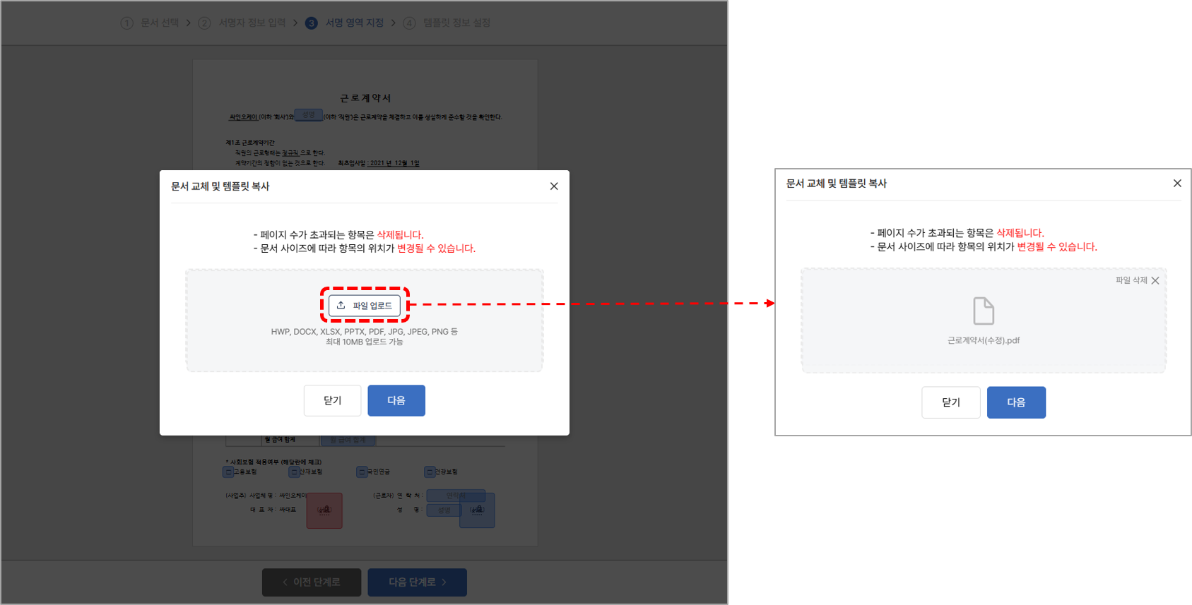 4. [문서 교체] 버튼을 클릭하고 파일을 업로드 합니다.