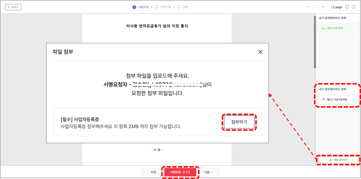 서명 요청자가 추가 첨부파일을 요청한 경우, 아래 방법을 통해 파일을 첨부할 수 있습니다.