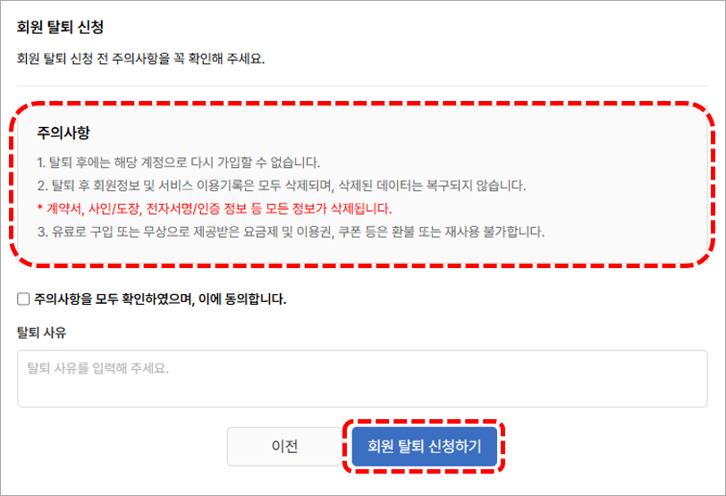 탈퇴 시, 완료 문서를 포함한 모든 문서와 템플릿이 영구적으로 삭제되며, 복구되지 않습니다.