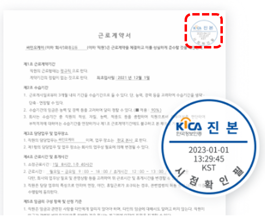 공인인증기관을 통해 전자문서 생성 시점 확인과 진본성 확인을 통해 해당 전자문서가 어느 특정 시각에 존재했었다는 것을 증명하고, 그 시각 이후에 데이터가 변경되지 않았음을 증명하는 서비스 입니다.