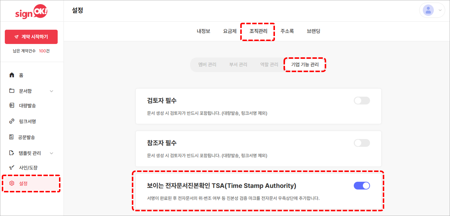 1. 최고관리자 계정으로 싸인오케이 로그인 후 좌측의 [설정] 메뉴를 클릭합니다.