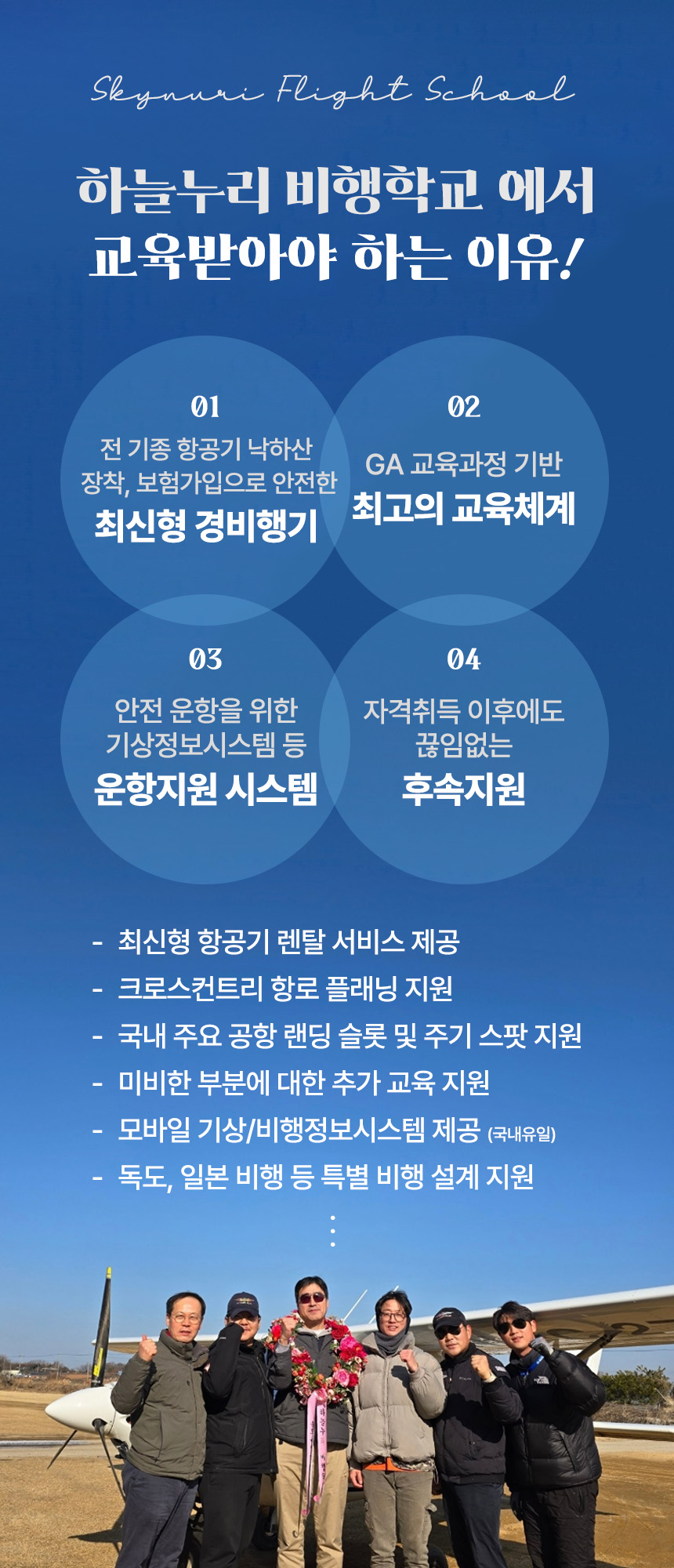 하늘누리 비행학교는 여수/양양공항 등 국내 대형 정규공항을 터치앤고/스탑앤고 하는 형태로 야외비행 교육을 진행하고 있습니다.