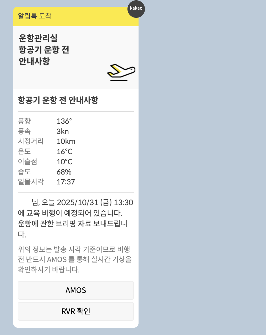 비행 당일 2시간 전에는 알림톡으로 당일 비행에 대한 브리핑 정보도 보내드립니다.