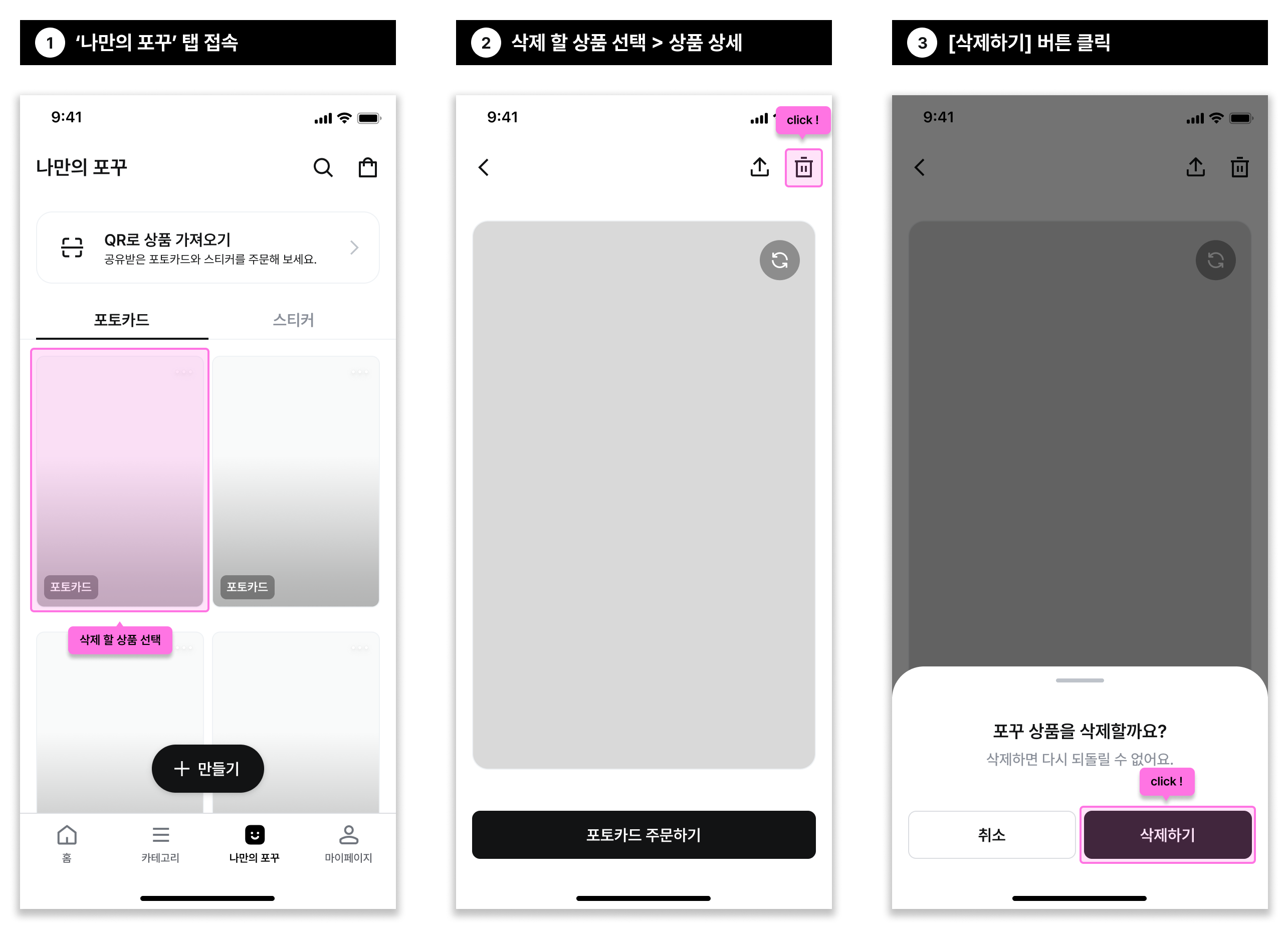 [삭제하기] 버튼을 누르면 해당 상품은 ‘나만의 포꾸’ 앨범에서 삭제 처리가 되어요.