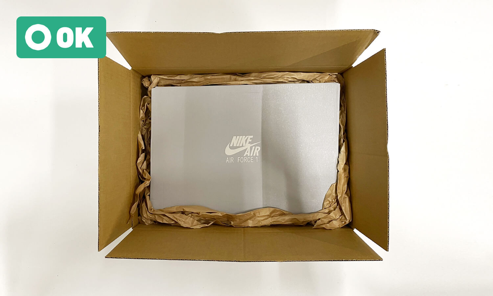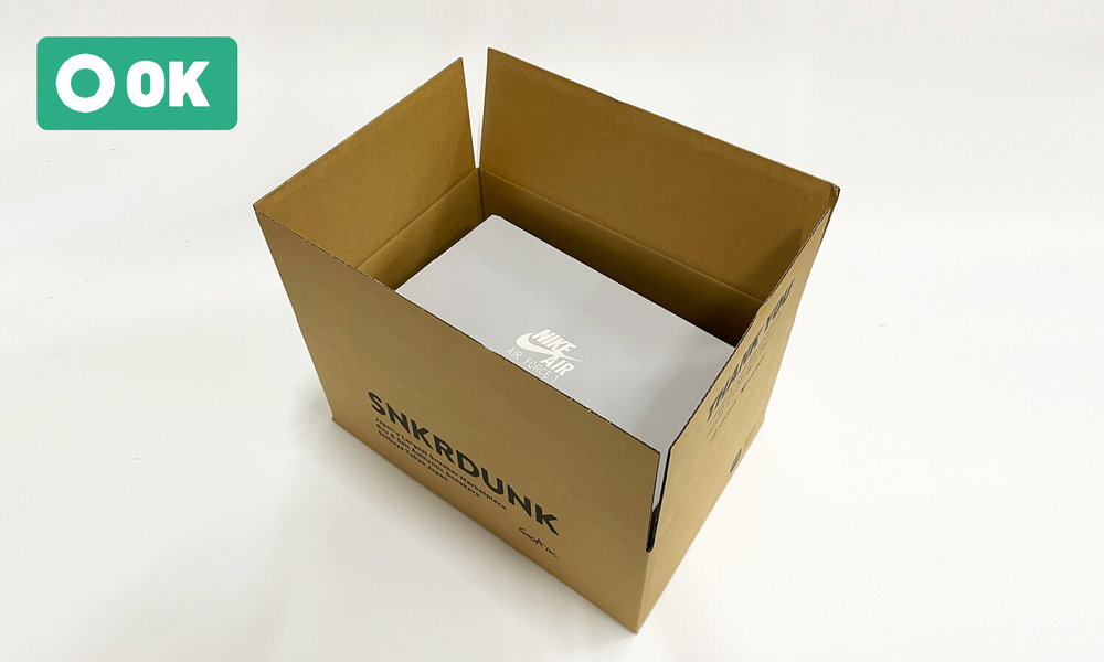 スニーカーボックスに破れ、傷、凹みなどが発生しないよう、必ずダンボールを利用してください。また、ボックスの大きさにあったダンボールの利用をお願いいたします。