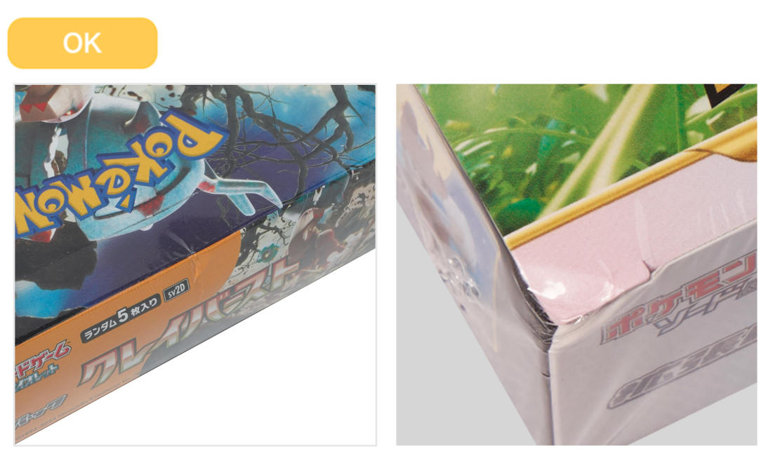 開封の痕跡や袋に一部でも破れが生じている商品は、中身(カード)のすり替えが可能なことから、ガイドライン基準を満たしていないと判断いたします。