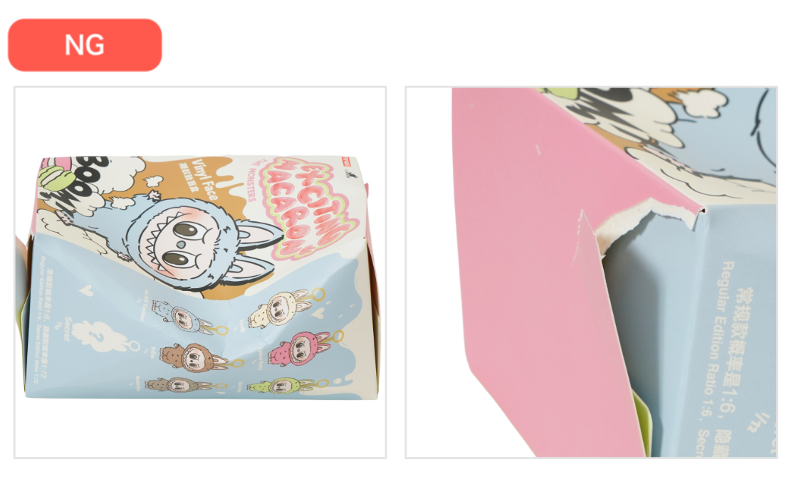 また、保管時に生じ得るボックスのダメージは基準内だと判断しておりますが、新品未開封の商品に対して以下の画像のような大きな破れ等が見られる場合には、購入者へ取引の継続可否を確認する場合がございます。