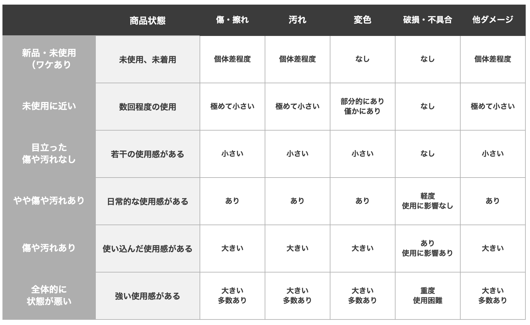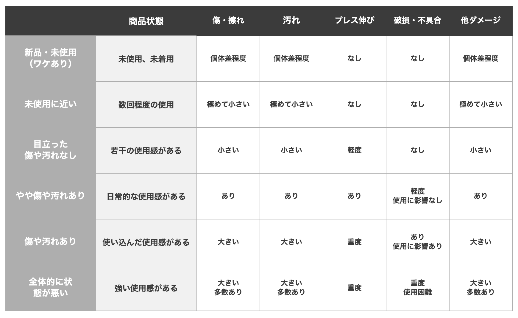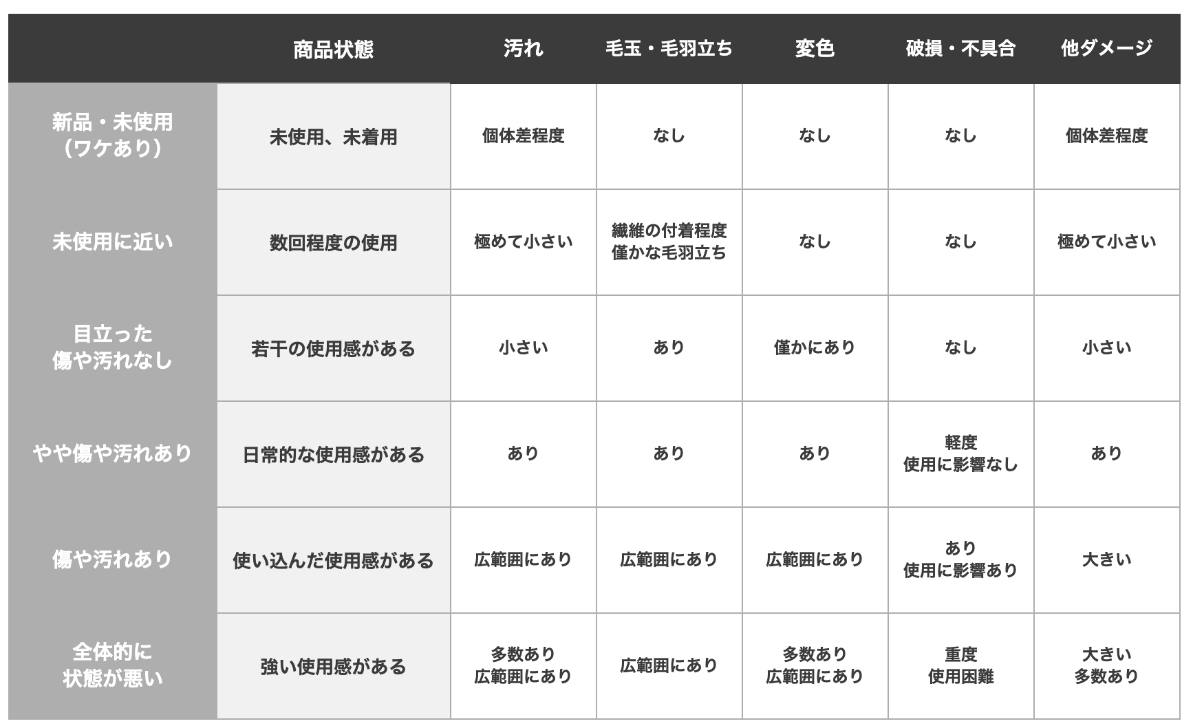 また、アイテムごとの詳細な基準については、下部の「アイテム別 状態一覧表」をご確認ください。
