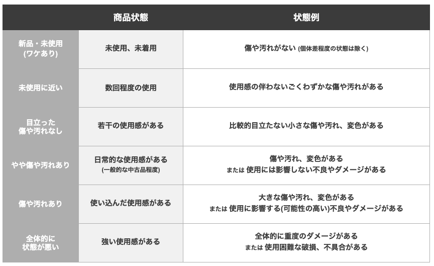 以下の表を参考に、最も適した状態レベルから出品してください。