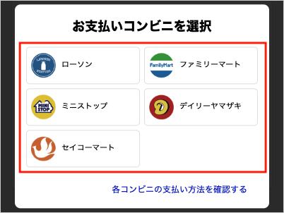 コンビニ払いの受付番号は、取引画面でお支払い先のコンビニを選択すると、番号が表示されます。支払期限内にお支払いを完了させてください。