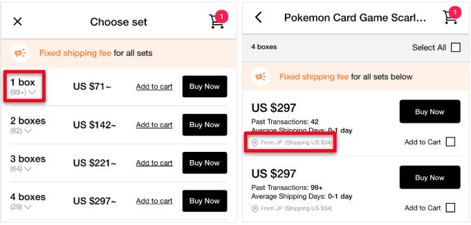 From this list, you will be able to check the shipping origin ("From JP"), shipping fees, and the number of completed transactions from the seller of that specific item.