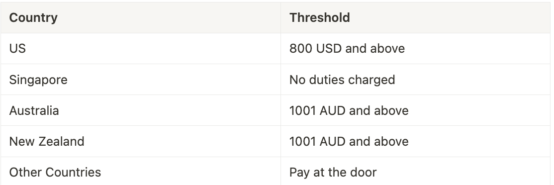 If the total price of all items in your cart order go above the price thresholds shown above, you will be informed on the purchase confirmation screen about the payment amount for customs duties and taxes which will be then collected at the time of payment.